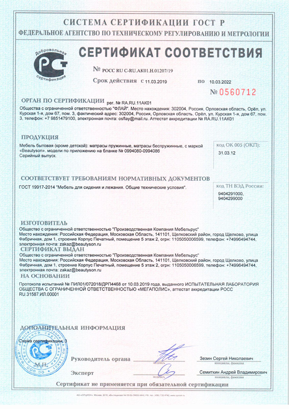 Гарантийные сроки от 18 месяцев до 60 месяцев, с даты, которая указана в накладной, в зависимости от модели матраса
